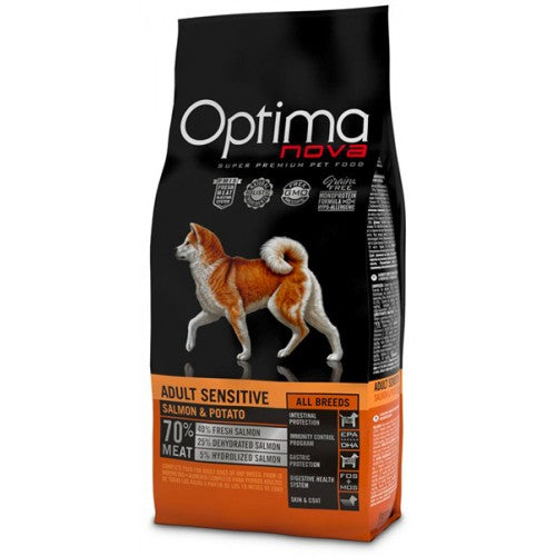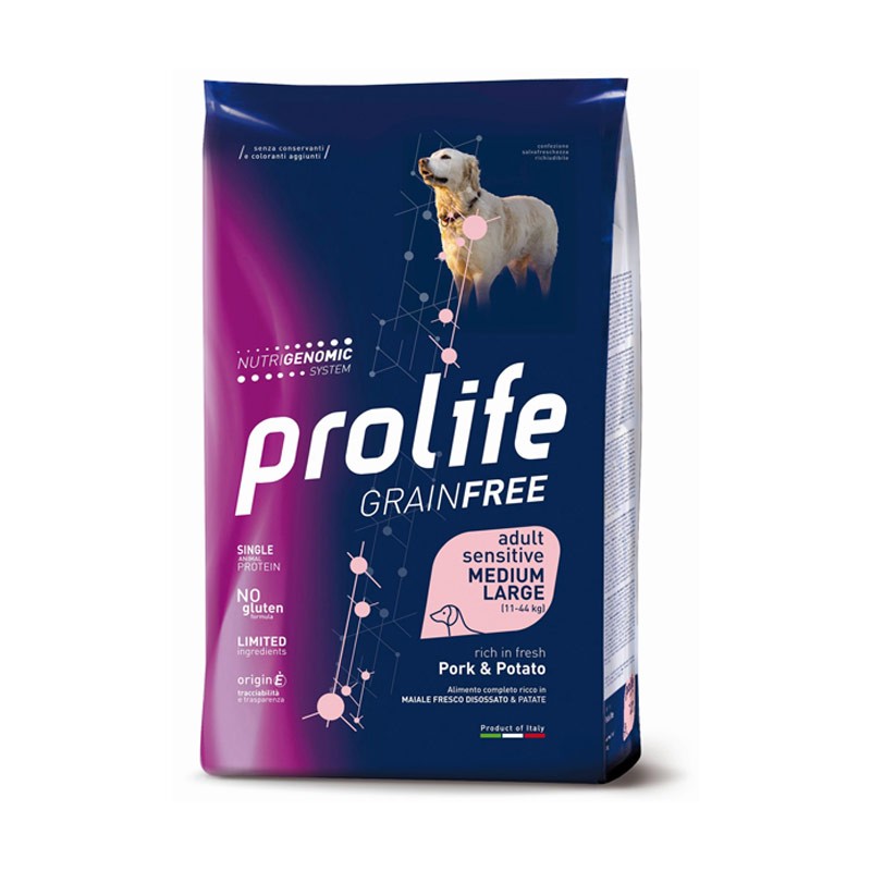 Pesce (salmone disidratato 26%, fresco 10%), riso (15%), granturco, polpa di barbabietola essiccata, lievito di birra, proteina di pesce idrolizzata, olio di pesce (olio di salmone), glutine di granturco, sostanze minerali, prodotti del lievito (mannano oligo saccaridi MOS 1%), xilo-oligosaccaride (XOS 0,3%), yucca schidigera (0,3%), farina di alghe (spirulina – Arthrospira platensis 0,3%), prodotti ottenuti dalla trasformazione di vegetali (radice di Echinacea purpurea 0,2%, Origanum Vulgare 0,1%), aglio essiccato (0,2%), glucosamina, solfato di condroitina.